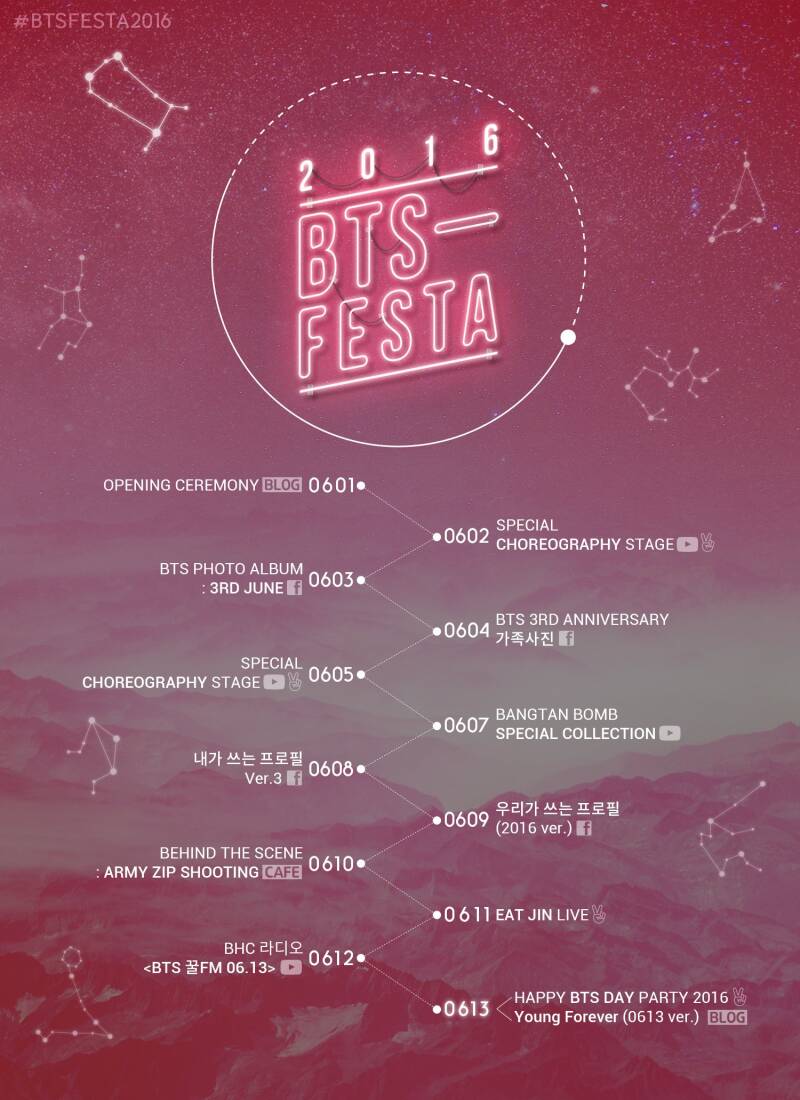 El día de hoy tengo el agrado de platicarte a detalle todo lo que sucedió en el Festa 2016. A mi parecer este festa fue el que dió apertura a festejar el aniversario de BTS a lo grande, con regalos y sorpresas para ARMY. Todo inicia con el cartel oficial, que es publicado en la cuenta oficial de Twitter, en donde nos anuncian todas las actividades que habrá por el gran festejo.