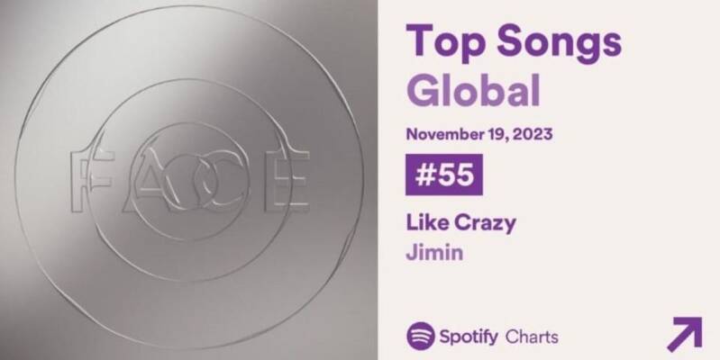 Like Crazy, la canción principal del álbum FACE, actualmente tiene el récord de LA CANCIÓN COREANA MÁS TRANSMITIDA EN 2023 en Spotify. Además FACE es el segundo álbum más reproducido de un artista coreano,durante el 2023, también en Spotify, y cuenta con mas de 1,400 millones de reproducciones en la misma plataforma. FACE esta encaminado a lograr 4 pistas (de 6) con más de 100 millones de streaming, lo cual lo convertirá en el primer álbum solista en la historia en lograrlo. Y dos de las canciones, Like Crazy ver. Inglés y Set Me Free, van en camino a los 300 millones de reproducciones cada una.